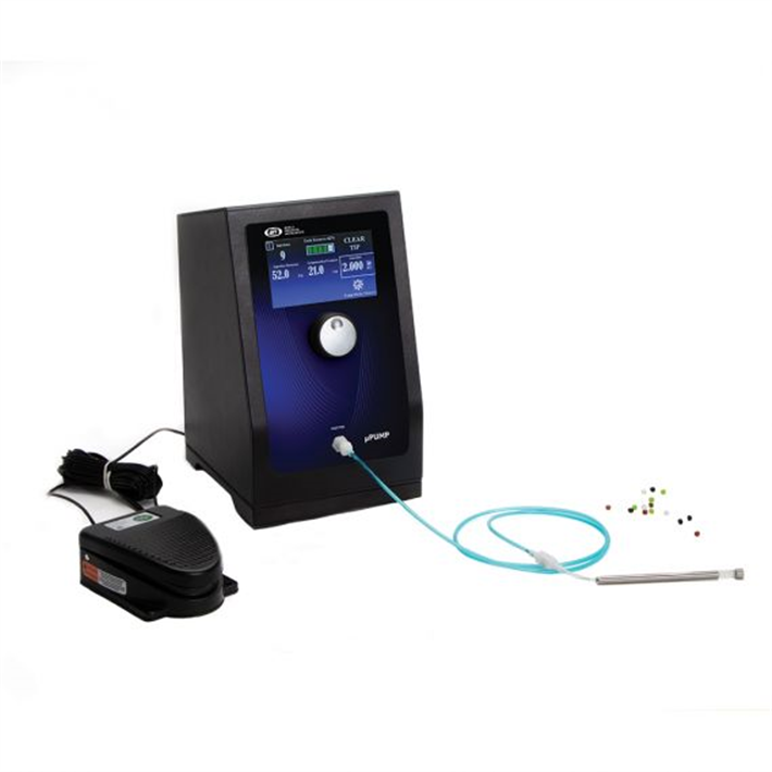 The µPUMP offers separate regulated compensation (back filling prevention) and ejection pressures with a precision timing circuit that switches from injection pressure to compensation pressure automatically.