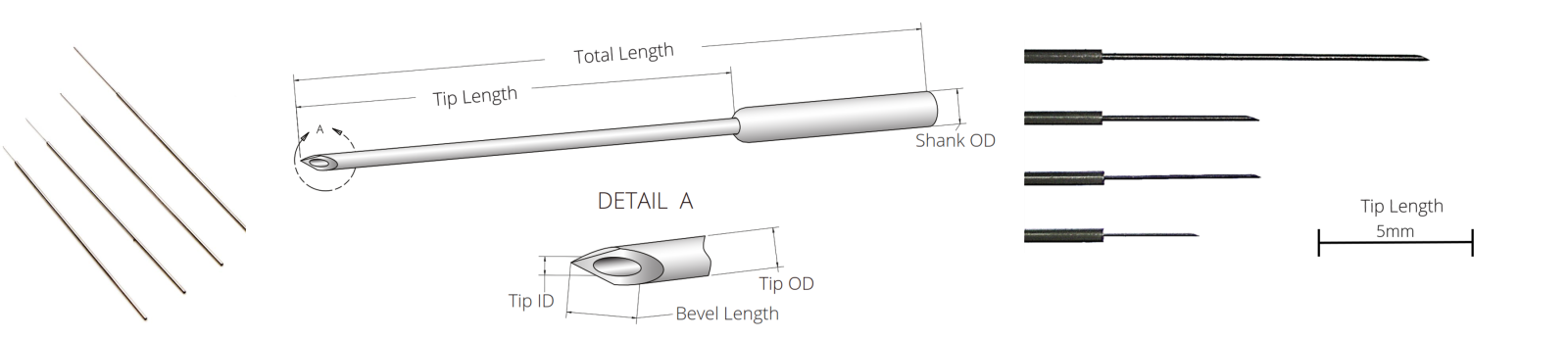 The replaceable needles used with the NanoFil are available with either blunt or beveled tip designs. The blunt tip is used for injection into soft tissue and when a uniform solution distribution is needed. The beveled style NanoFil needles are used for applications that involve the penetration through a tough tissue. Nanofil needles are offered in sizes of 26G to 36G (OD of 460 µm to 120 µm).