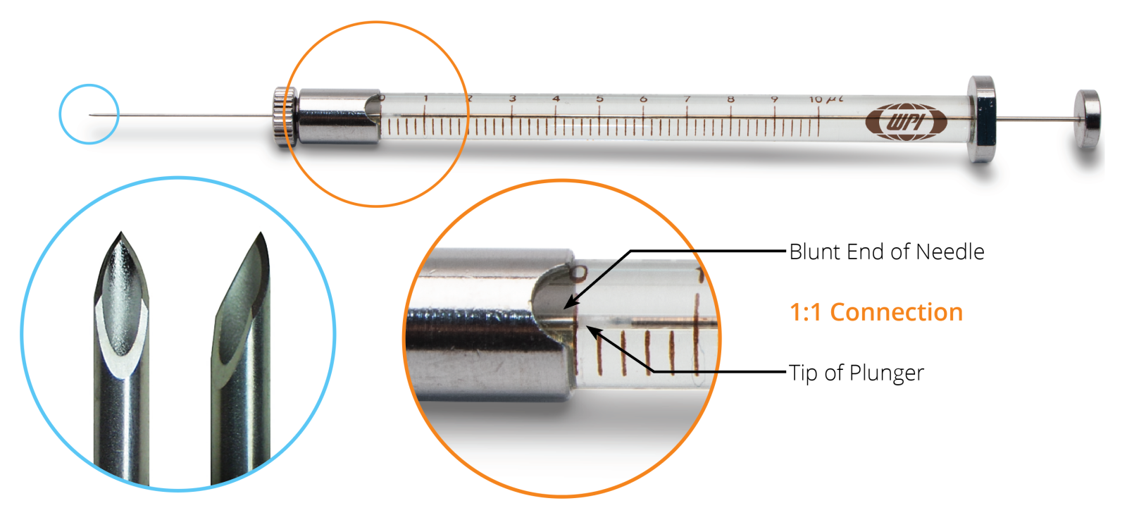 Gas-tight control is particularly critical for applications requiring utmost accuracy and precision during low-volume fluid handling. Having a quality gas-tight design ensures a vacuum-like seal between the syringe and needle, supplying the necessary force to advance small samples forward during delivery, and upwards during withdraw. NanoFil’s virtual zero dead-volume comes from its thoughtfully designed coupling mechanism, where all WPI NanoFil™ needles insert directly into the syringe barrel, creating a 1:1 connection with the syringe’s plunger. Priming your syringe is made effortless with unparalleled control, supported by a sure-seal, gas-tight system.