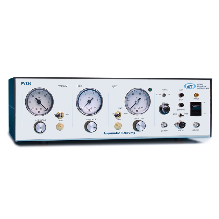 WPI™s PicoPumps use carefully regulated air pressures for securing cells and injecting them with fluid. Injected volumes range from picoliters to nanoliters. Separate ports supply positive and negative pressure - positive pressure for high-pressure ejection, and suction for supporting the cell or for filling the pipette from the tip. A second pressure port maintains a low positive "holding" pressure to the injecting pipette between injection pulses, to prevent fluid up­take through capillary action or diffusion. Timing, ejection pressure, holding pressure, and suction are adjusted independently by control knobs and indicator gauges on the front panel. Injection pressure is controlled by a 20-turn regulator on the front panel. A built-in timing circuit allows precise control of the amount of time that the injection pressure is applied to the output port. Time intervals can range from 10 seconds down to 10 ms or less, depending on the eject pressure setting. The injection pressure interval can be triggered manually on the front panel, by footswitch, or by computer controlled TTL pulse. A 5 volt monitor output provides a logic-level pulse for your computer or other monitoring device.