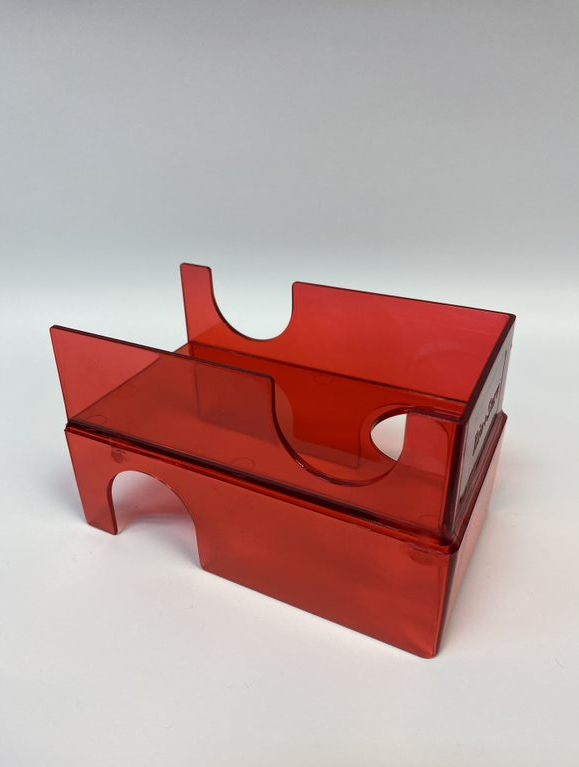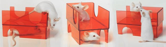 The bi-level design offers a platform for undersized weanlings to reach the food source on cage lids, as well as a means for submissive mice to find shelter and easily move away from dominant mice, thereby minimizing fighting injuries as compared to other shelters that trap the mice inside.